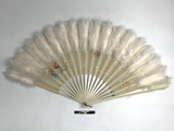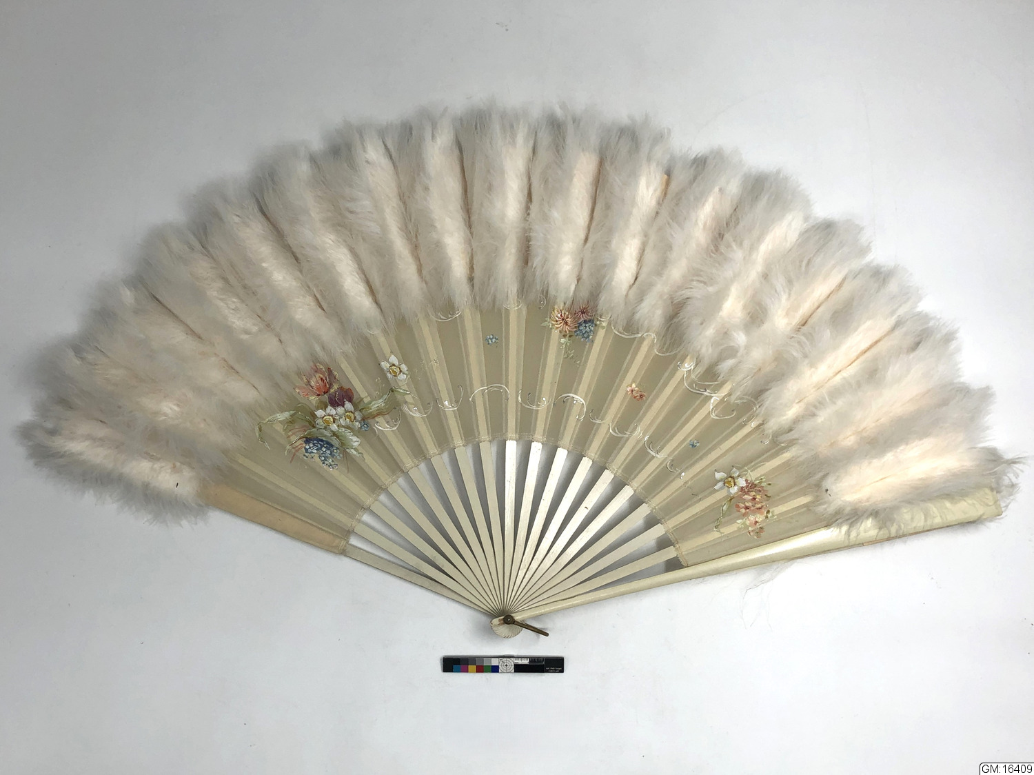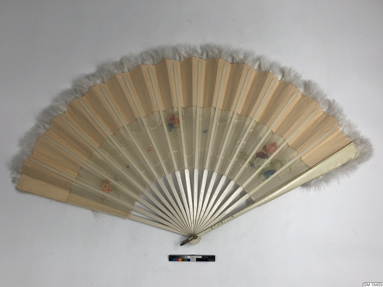 Solfjäder, bemålat siden med svandun i ytterkanten.
