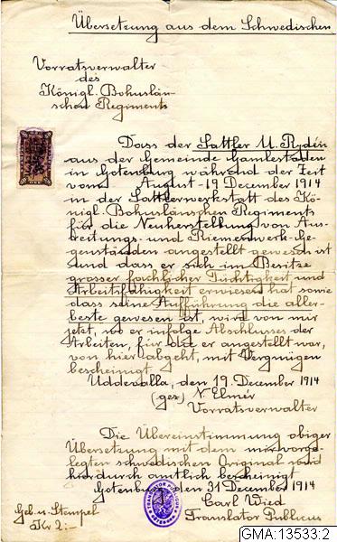 Översättning till tyska av ett intyg från Bohusläns regemente, inför resa till Tyskland 1914 31/12. Originalintyget har inventarienummer GMA:13529:8, 19/12 1914.