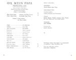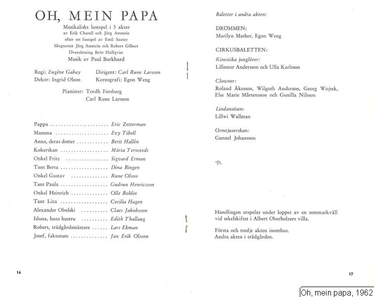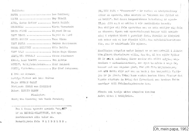 "Musikaliskt lustspel: Oh, Mein Papa, E. Charell, J. Amstein, E. Sautter, musik P. Burkhard, 10.12.1954-55, kostym: Inga Svensson. Repriser emd samma dräkter: 28.2.1962, 7.4.1963. "//ur katalogkort 2011-09-26 lzg; Musikaliskt lustspel i tre akter av Erik Charell och Jürg Amstein efter ett lustspel av Emil Sautter, sångtexter Jürg Amstein och Robert Gilbert.