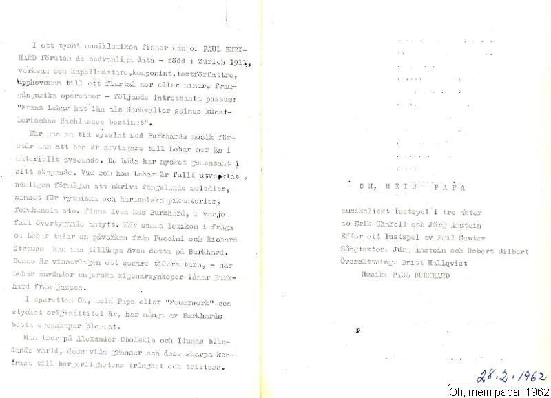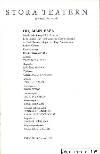 "Musikaliskt lustspel: Oh, Mein Papa, E. Charell, J. Amstein, E. Sautter, musik P. Burkhard, 10.12.1954-55, kostym: Inga Svensson.