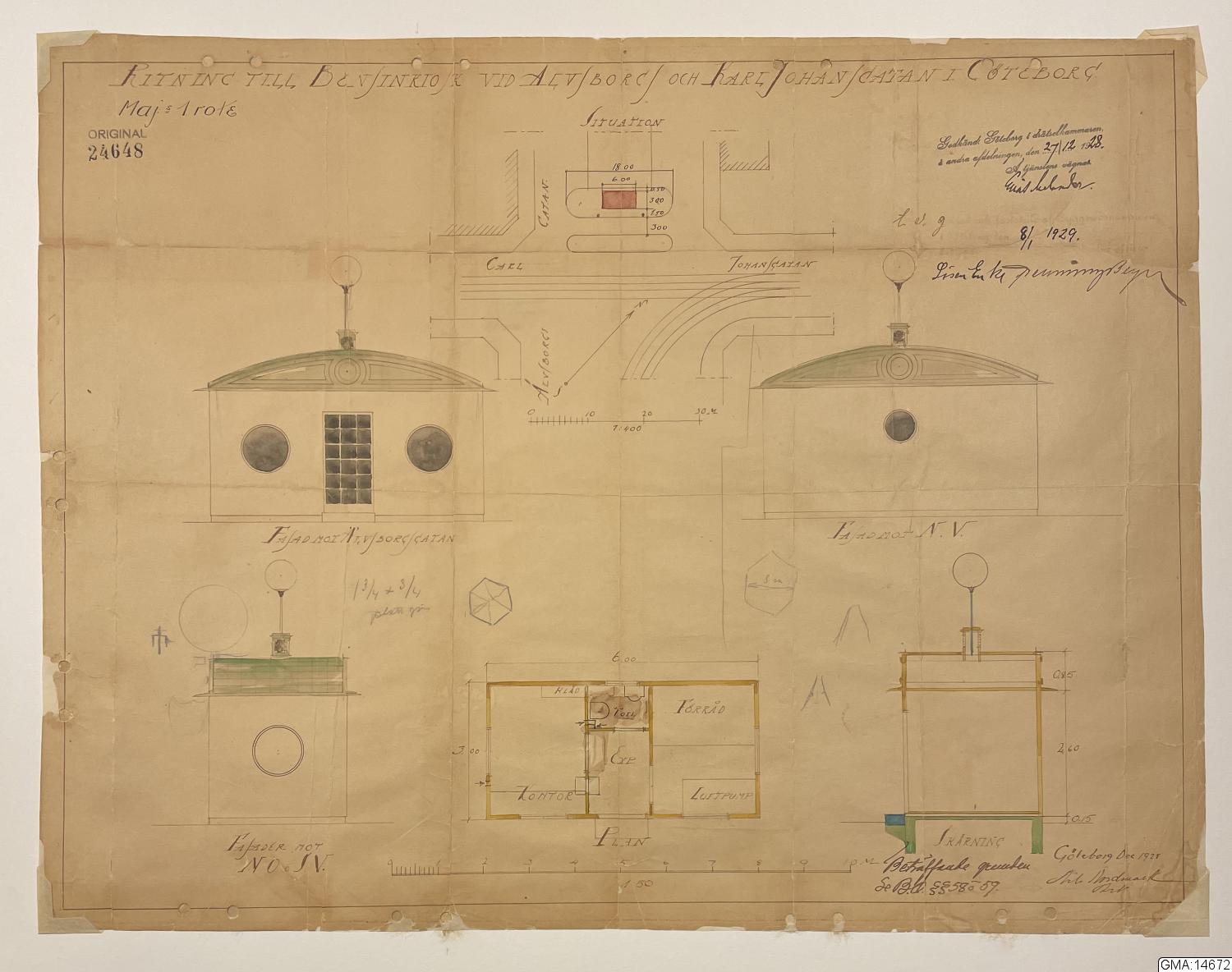 - Ritning till bensintapp på Karl Johansgatan vid korsningen med Älvsborgsgatan. Dat. dec. 1928 och sign. Nils Nordmark.