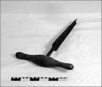Träborr eller "navare" med handtag av trä. Borret är 31 cm långt och urholkat (skålformat)