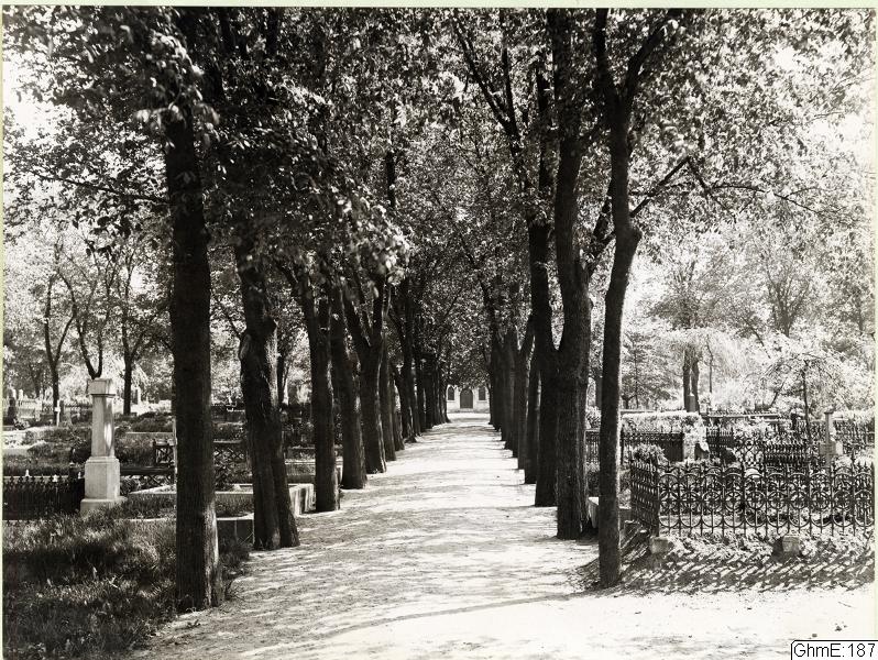 - Mariebergskyrkogården, allé med begravningskapellet i fonden. Kvarter med gravplatser omgärdade av gjutjärnsstaket.
