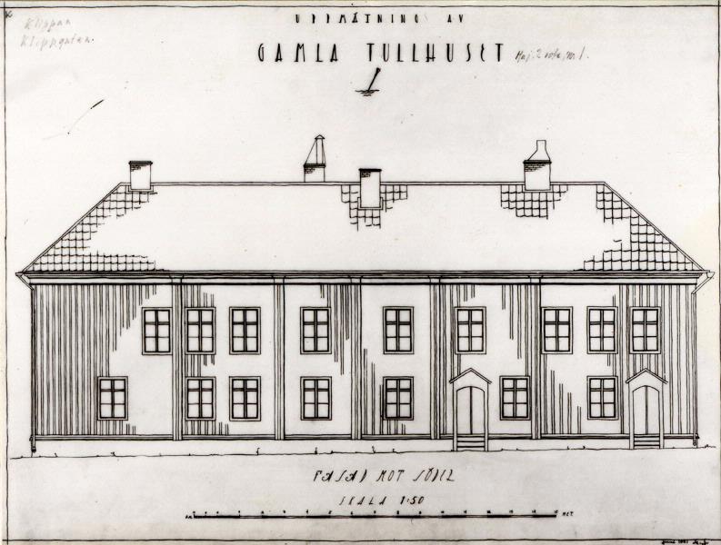 - Ritning av Svenska Ostindiska Kompaniets gamla kontorsbyggnad vid Klippan. Fasad mot söder. Uppmätningsritning sign. G.J.
