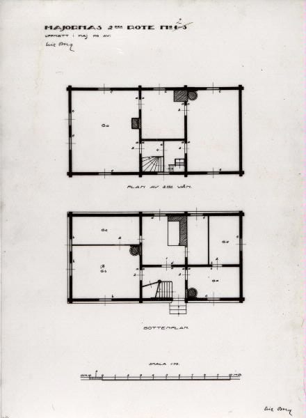 - Ritning över den äldsta kvarstående byggnaden i kvarteret nr. 1-3 av Majornas 2 rote. Överst bottenplan, nederst plan av vån 2. Uppmätningsritning av Eric Borg, maj 1916.