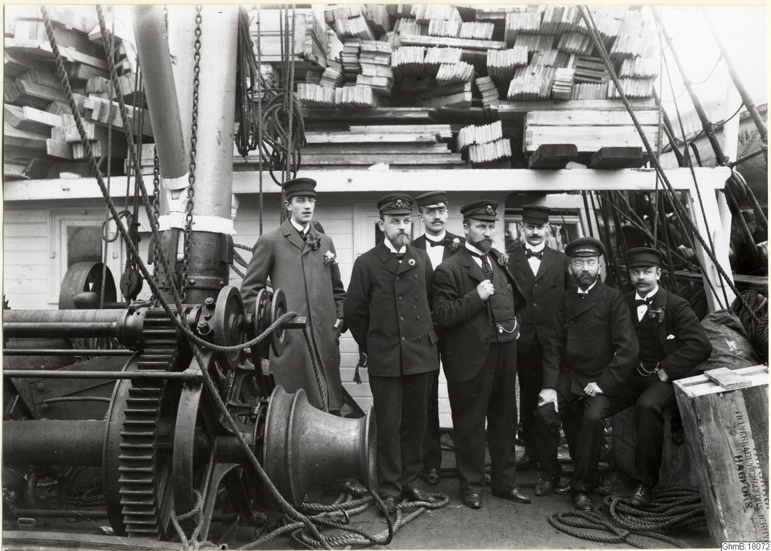 Svartvitt fotografi med medlemmar ur Otto Nordenskjölds expedition till sydpolen. "Antarctic" avseglade från Göteborg 1901-10-16. Männen på däcket är från vänster: