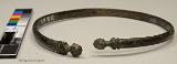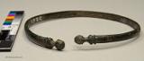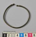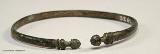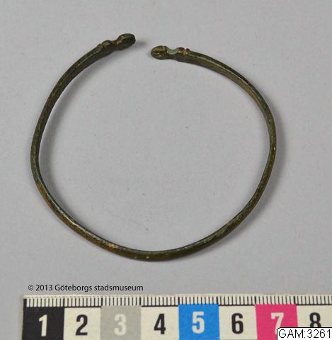 Armring av brons med halvklotformiga ändstycken. Funnen i en hög jämte människoben i byn Bjellum, Bolum socken.