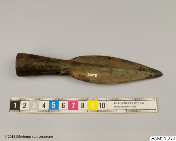 - "Spjutspets av brons med skaftholk, 15.3 cm lång (gl n:r 244). Fyndort okänd. Österrike-Ungern."