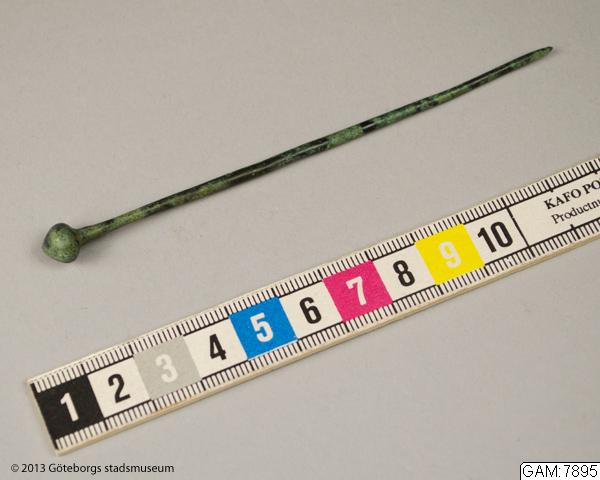 "Nål av brons med knoppformigt huvud, 11.4 cm lång."