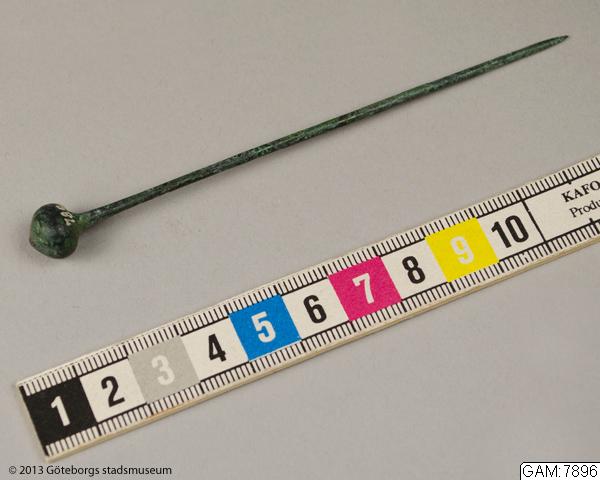 "Nål av brons med knoppformigt huvud, 11.4 cm lång."