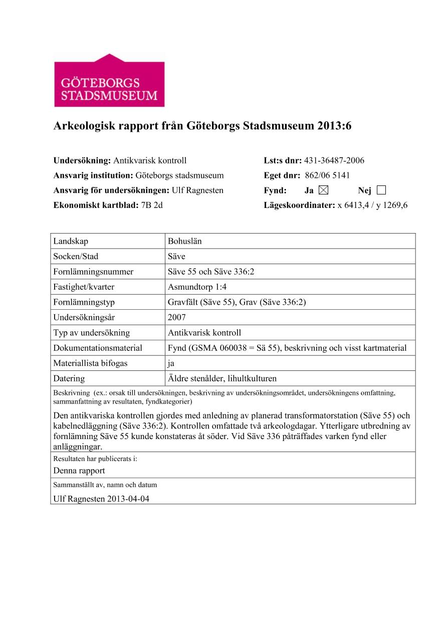 Arkeologisk rapport från Göteborgs Stadsmuseum 2013:6; Säve 55 och Säve 336:2;