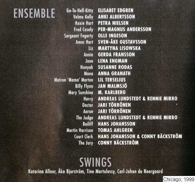 Go-To-Hell-Kitty; Velma Kelly; Roxie Hart; Fred Casely; seregeant Fogarty; Amos Hart; Liz; Annie; June; Hunyak; Mona; Matron ´Mama´Morgon; Billy Flynn; Mary Sunshine; Harry; doctor; Aaron; the judge; Bailiff; Martin Harrison; court Clerk; the jury; swings