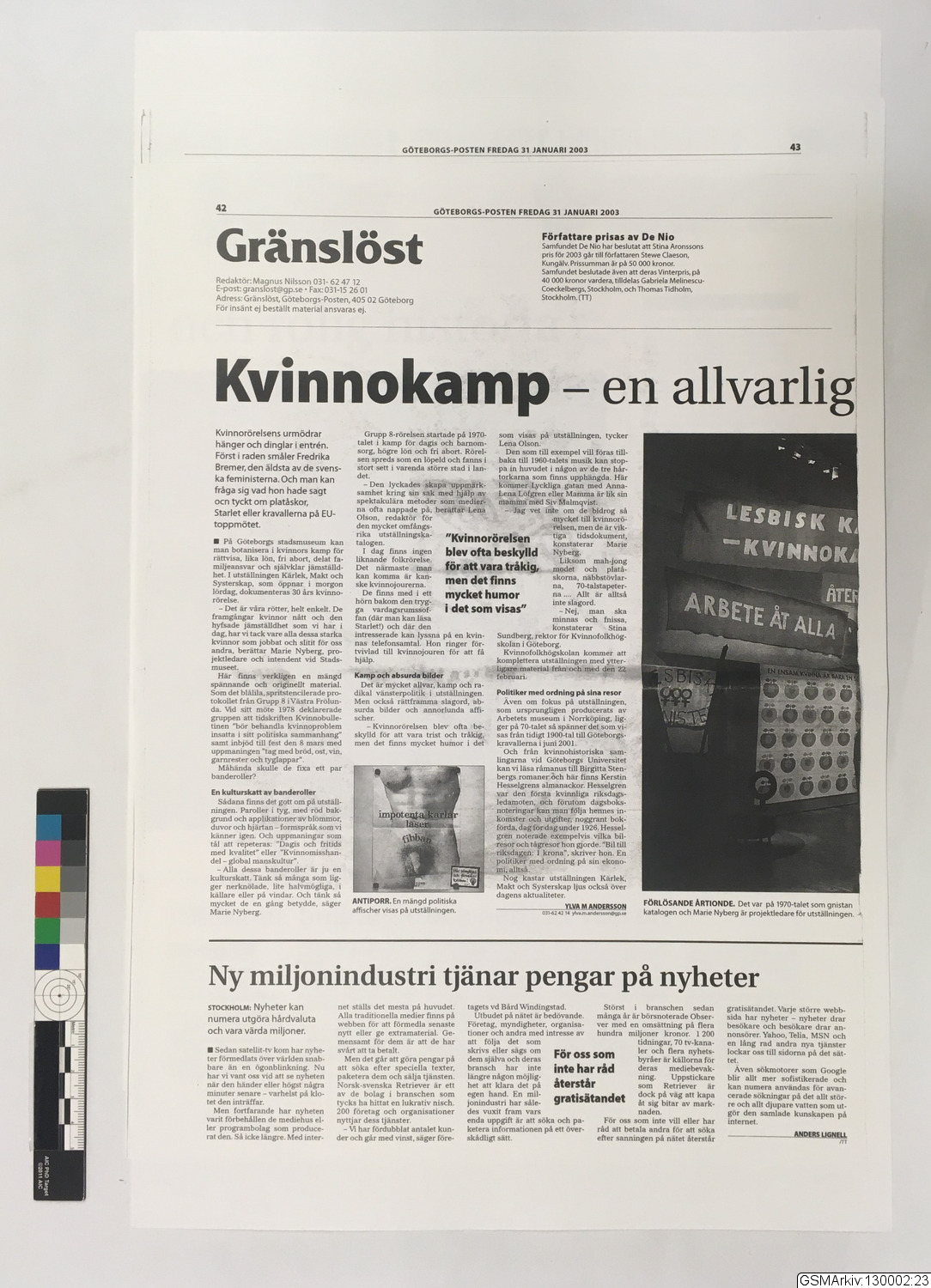 - Tidningsartikel från Göteborgs-Posten, 31 januari 2003, med titeln "Kvinnokamp - en allvarlig och rolig historia". Handlar om utställningen "Kärlek, makt och systerskap" på Göteborgs stadsmuseum 2003. Skriven av Ylva M Andersson.