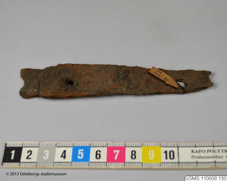Del av beslag av smitt järn. Längd 12 cm, bredd 2.5 cm. Se protokoll av den 29 juni 1915. [enl. katalogkort]