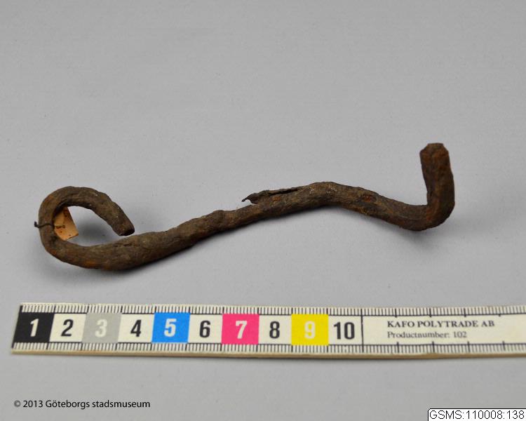 Hasp av smitt järn. Ena änden böjd till en ögla, den andra nedåtböjd till krok. Längd 12.3 cm, tjocklek 0.7 cm. Jmfr. 1915 No 18.