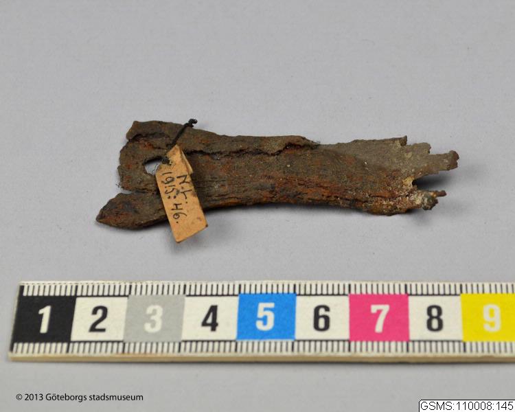 Beslag av smitt järn, del av, med ett hål för spik. Längd 6 cm, bredd 2.5 cm.