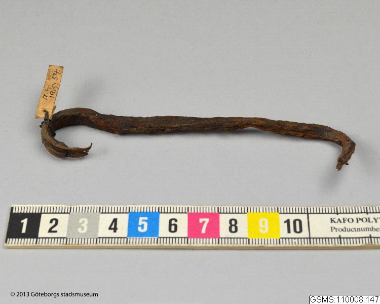 - Hasp av smitt järn. Längd 11 cm, tjocklek 0.7 cm. Se protokoll av den 8 juli 1915. Jmfr. 191 No 18.