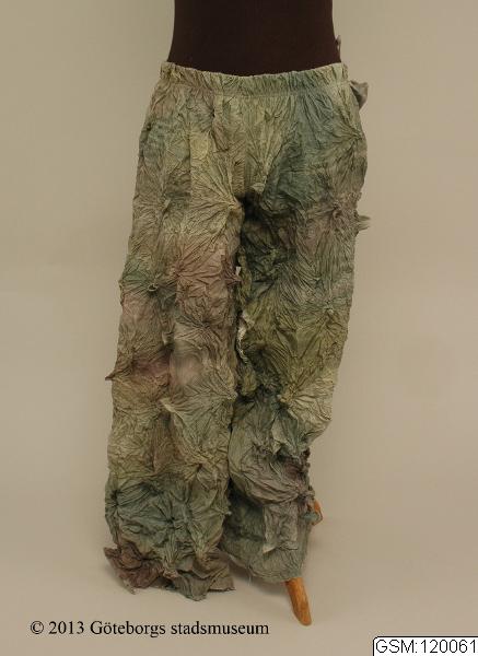 - Byxa till tvådelad danskostym bestående av överdel och byxor i knytbehandlad och färgad bomull i olika nyanser av ljust grått, grönt och lila. Tyget i danskostymen är format av knytbehandlingen med skrynklor och utstående "piggar". Byxorna har ett svart resårband i midjan och ofållade benslut. I midjan sitter en märklapp från Göteborgsoperan där det står "Fernando Melo Body & Soul -07".