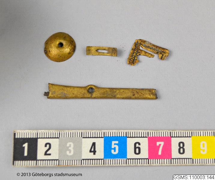 "Mässingbeslag. 4 st. L. 5.3 x 0.7 - 1.5 x 0.4 cm." [enl. katalogkort]