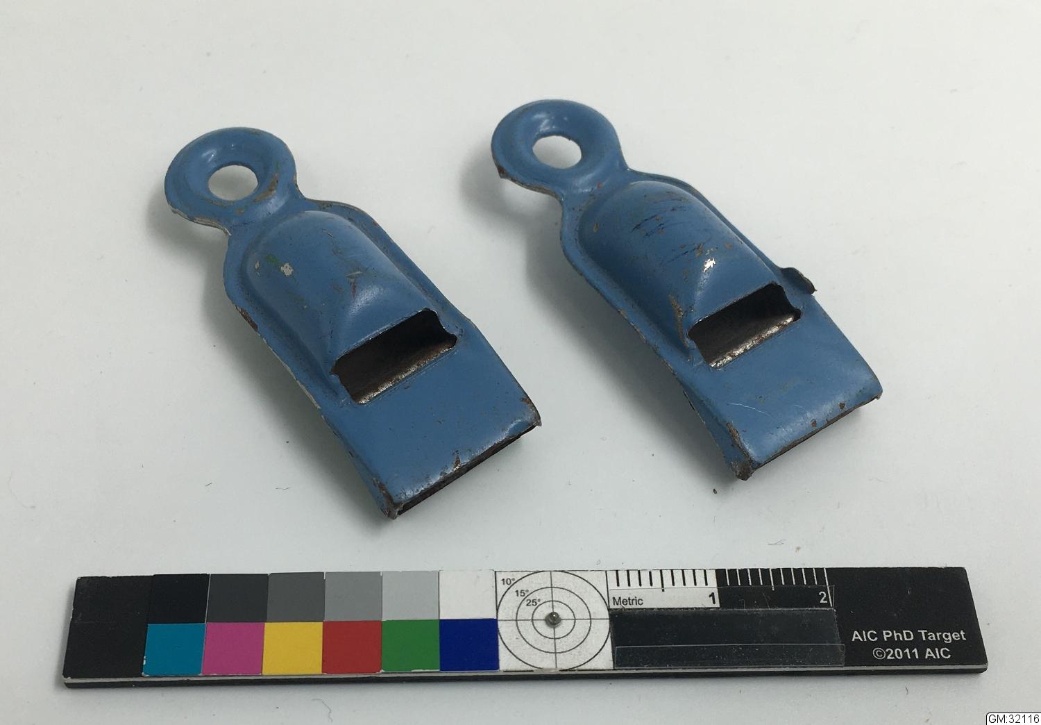 2 st små, delvis runda visselpipor av bleckplåt, med ring i ena kanten för snöre.