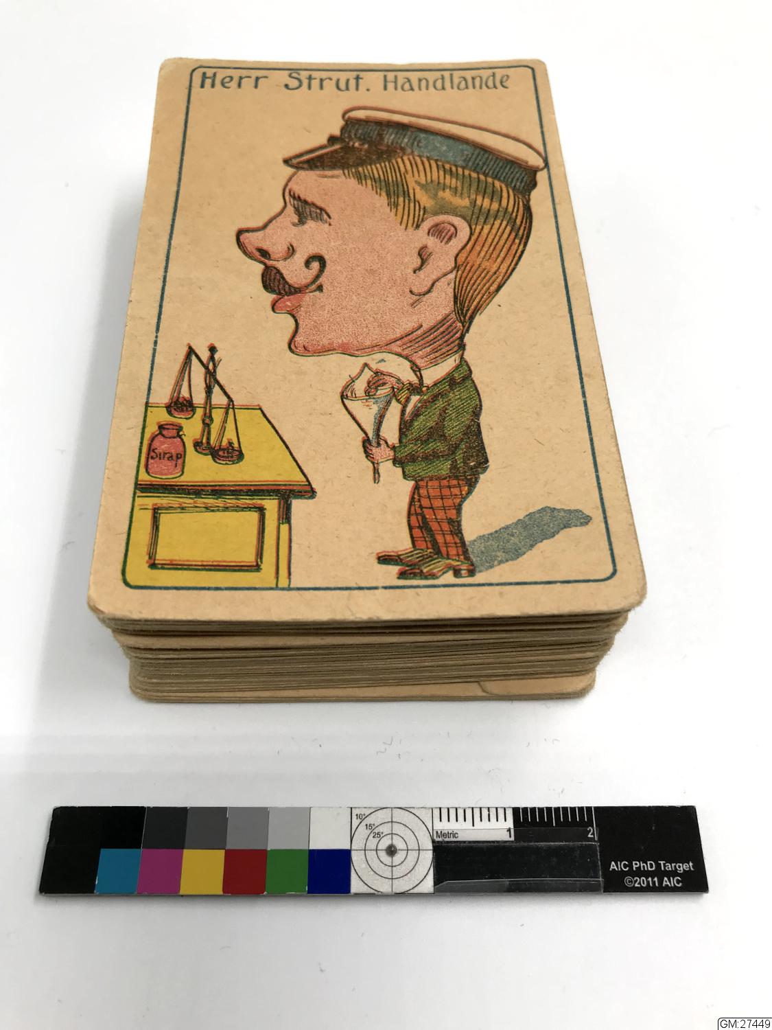 - Kortspel, Löjliga familjerna, med 48 st spelkort med tryckta färgillustrationer. Numrerade GM:37449:1-48.