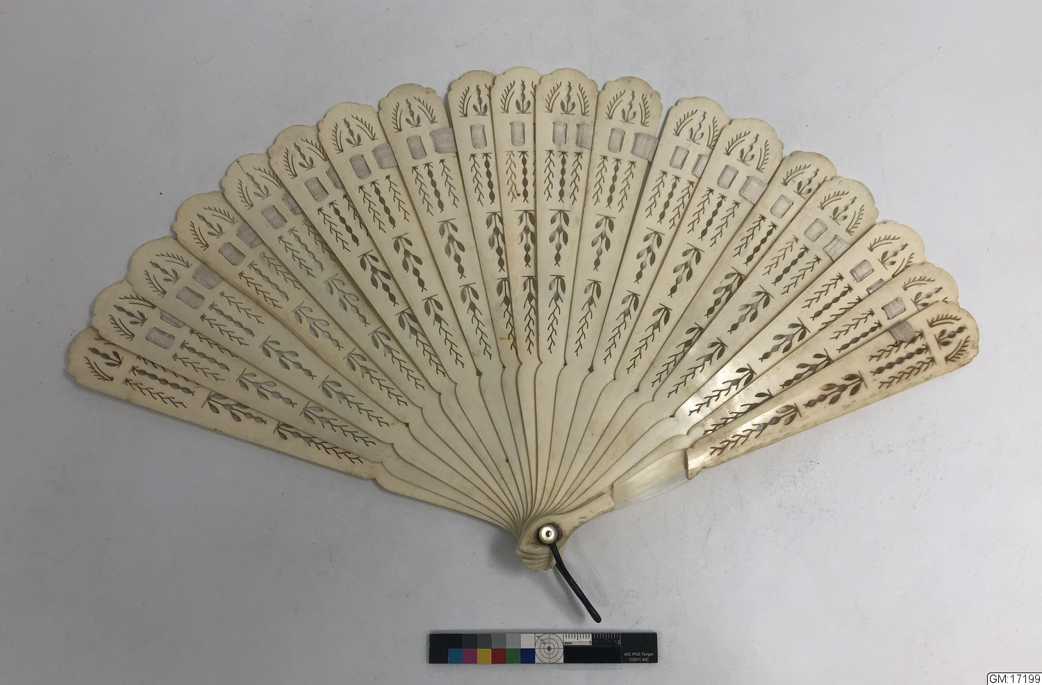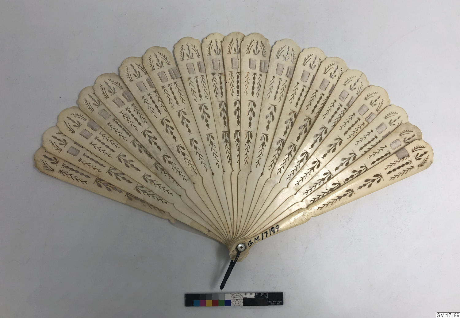 Solfjäder i ben med genombrutet mönster.
