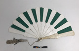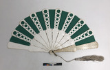 Solfjäder med spröt av vit papp och skärm av grönt siden.