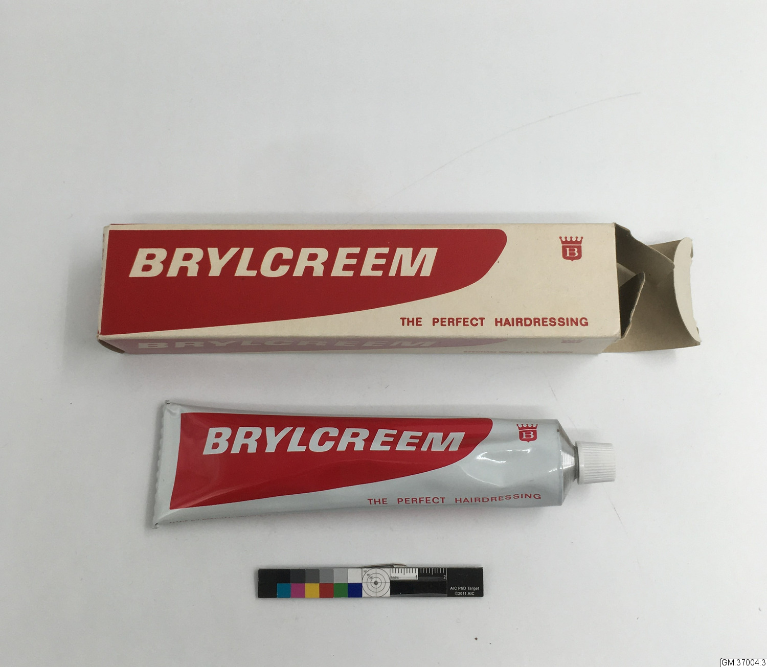 :1 Rektangulär pappkartong som kan öppnas i båda ändarna. Vit bottenfärg med rött tryck. Text: "Brylcreme Haircreme. Large Tube. Made by Beecham Products A/S Denmark". L: 17 cm B: 4,5 cm H: 4 cm