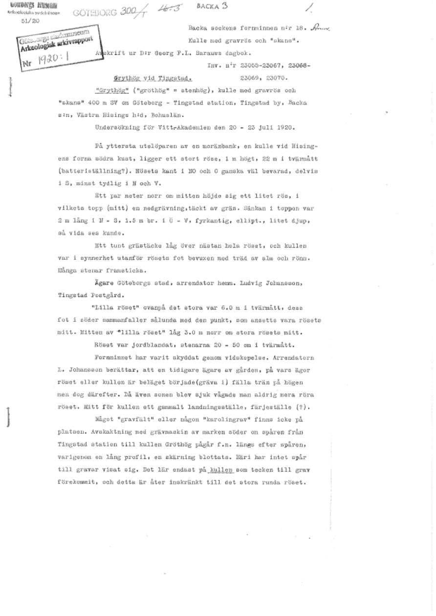 Arkeologisk rapport 1920:1; Grythög vid Tingstad