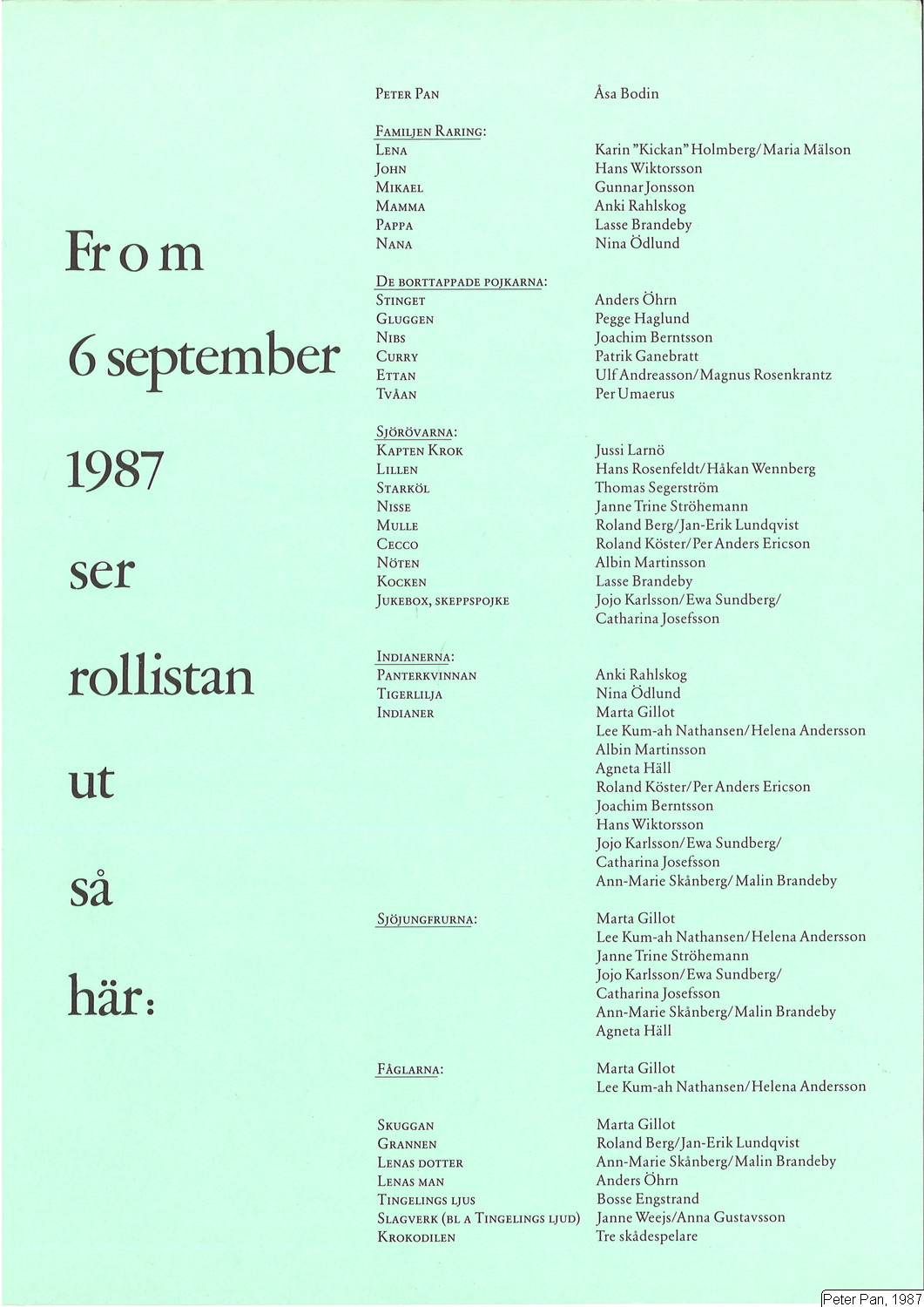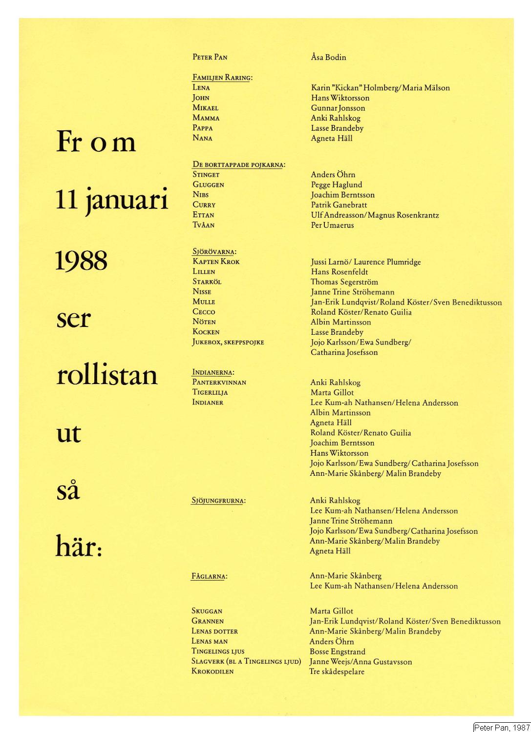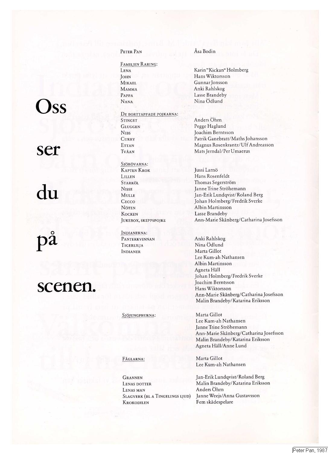 Peter Pan [Bodin, Åsa]; Lena [Holmberg, Karin "Kickan"]; John [Wiktorsson, Hans]; Mikael [Jonsson, Gunnar]; Mamma [Rahlskog, Anki]; Pappa [Brandeby, Lars]; Nana [Ödlund, Nina]; Stinget [Öhrn, Anders]; Gluggen [Haglund, Pegge]; Nibs [Berntsson, Joachim]; Curry [Ganebratt, Patrik & Johansson, Maths]; Ettan [Rosenkrantz, Magnus & Andreasson, Ulf]; Tvåan [Jerndal, Mats & Umaerus, Per]; Kapten Krok [Larnö, Jussi]; Lillen [Rosenfeldt, Hans]; Starköl [Segerström, Thomas]; Nisse [Ströhemann, Janne Trine]; Mulle [Lundqvist, Jan-Erik & Berg, Roland]; Cecco [Holmberg, Johan & Sverke, Fredrik]; Nöten [Martinsson, Albin]; Kocken [Brandeby, Lars]; Jukebox, skeppspojke [Skånberg, Ann-Marie & Josefsson, Catharina]; Panterkvinnan [Rahlskog, Anki]; Tigerlilja [Ödlund, Nina]; Indian [Gillot, Marta]; Indian [Nathansen, Lee Kum-ah]; Indian [Martinsson, Albin]; Indian [Häll, Agneta]; Indian [Holmberg, Johan & Sverke, Fredrik]; Indian [Berntsson, Joachim]; Indian [Wiktorsson, Hans]; Indian [Skånberg, Ann-Marie & Josefsson, Catharina]; Indian [Brandeby, Malin & Eriksson, Katarina]; Sjöjungfru [Gillot, Marta]; Sjöjungfru [Nathansen, Lee Kum-ah]; Sjöjungfru [Ströhemann, Janne Trine]; Sjöjungfru [Skånberg, Ann-Marie & Josefsson, Catharina]; Sjöjungfru [Brandeby, Malin & Eriksson, Katarina]; Sjöjungfru [Häll, Agneta & Lund, Anne]; Fågel [Gillot, Marta]; Fågel [Nathansen, Lee Kum-ah]; Grannen [Lundqvist, Jan-Erik & Berg, Roland]; Lenas dotter [Brandeby, Malin & Eriksson, Katarina]; Lenas man [Öhrn, Anders]; Slagverk (bl. a. Tingelings ljud) [Weejs, Janne & Gustavsson, Anna]; Krokodilen [Fem skådespelare]