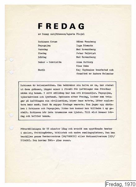 Robinson Kruse [Wennberg, Håkan]; Papegojan [Edwards, Inga]; Torsdag [Reventberg, Med]; Fredag [Wahlqvist, Peter]; Lördag [Reventberg, Med]