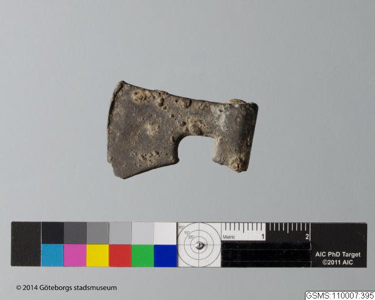 - "Yxa af bly". 4.2 x 3.2 cm. Står i katalogkorten under kategorin "leksaker".