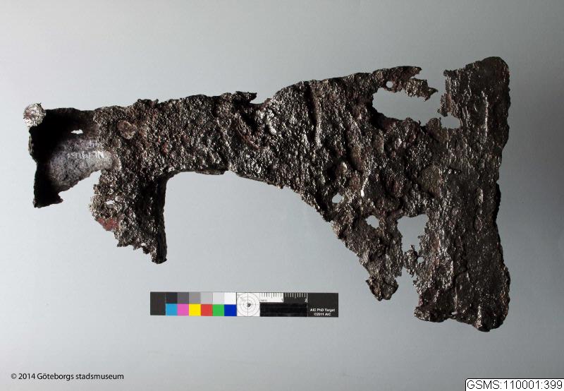 Yxa, af smitt järn. Jmfr. 1915 No 22. L: 19.6 cm, B: 11.3 cm.
