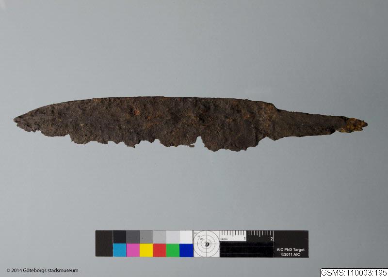 Knif-blad: af smitt järn. Jmfr. 1915 No 21. L: 13.3 cm, B: 2 cm.