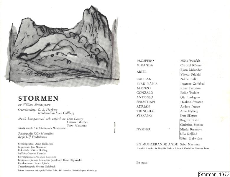 Beranova, Misela [nymf]; Carlehed, Ingemar [Ferdinand]; Falk, Niklas [Caliban]; Hafwsörn, Görel [nymf]; Janson, Anders, 1941- [Adrian]; Kollind, Ulla [nymf]; Körner, Christel [Miranda]; Lindegren, Ola [Antonio]; Martinez, Sabu [musicerande ande]; Melander, Björn, 1944- [Ariel]; Nyberg, Arne [Trinculo]; Seldahl, Viveka [Ariel]; Sjögren, Dan [Stefano]; Stahre, Birgitta [nymf; Iris]; Stenius, Christina [nyfm; Juno]; Svenson, Haakon [Sebastian]; Turesson, Rune [Alonzo]; Walder, Folke [Gonzalo]; Westfelt, Måns [Prospero]