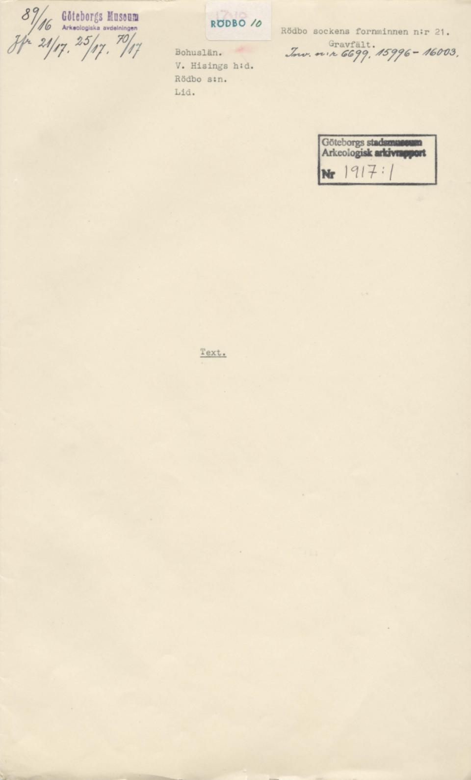 Arkeologisk rapport 1917:1; Avskrift ur D:r Georg F.l. Sarauws dagbok.; Rödbo sockens fornminnen n:r 21; Järnåldersgravfält och boplats. Lid i Rödbo s:n. ; Undersökt för Minnesutställningen 1917