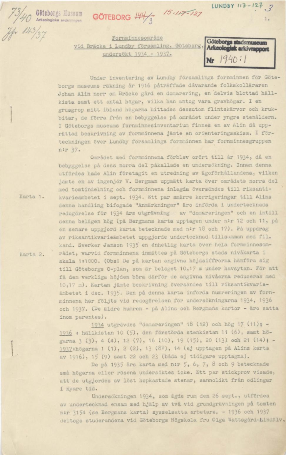Arkeologisk rapport 1940:01 :: rapport, arkeologisk rapport, arkeologisk arkivrapport