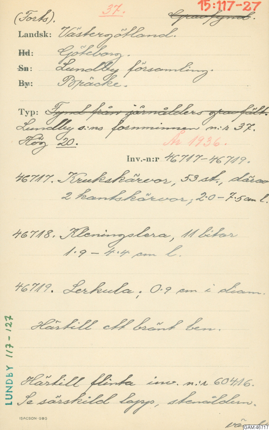 Lundby 119 [GAM:46725-46728, GAM:60425-60442, GAM:83610]; Lundby 126 [GAM:46721-46724, GAM:60417-60424]; Lundby 122 [inga fynd]; Lundby 117-127