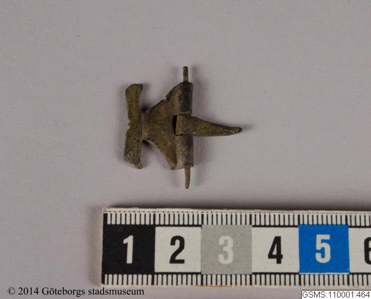 Del till spänne, af messing. L: 2.7 cm, B: 2.5 cm. [enl katalogkort]