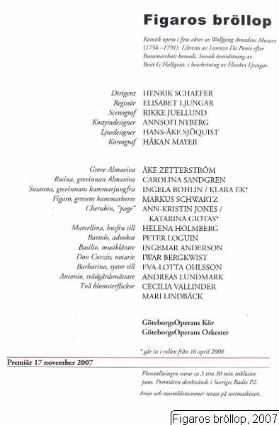 Anderson, Ingemar; Bergkwist, Iwar; Bohlin, Ingela; Ek, Klara; Giotas, Katarina; GöteborgsOperans Kör; GöteborgsOperans orkester; Holmberg, Helena, sångare; Jones, Ann-Kristin; Lindbäck, Mari; Loguin, Peter; Lundmark, Andreas; Ohlsson, Eva-Lotta; Sandgren, Carolina; Schwartz, Markus; Vallinder, Cecilia; Zetterström, Åke
