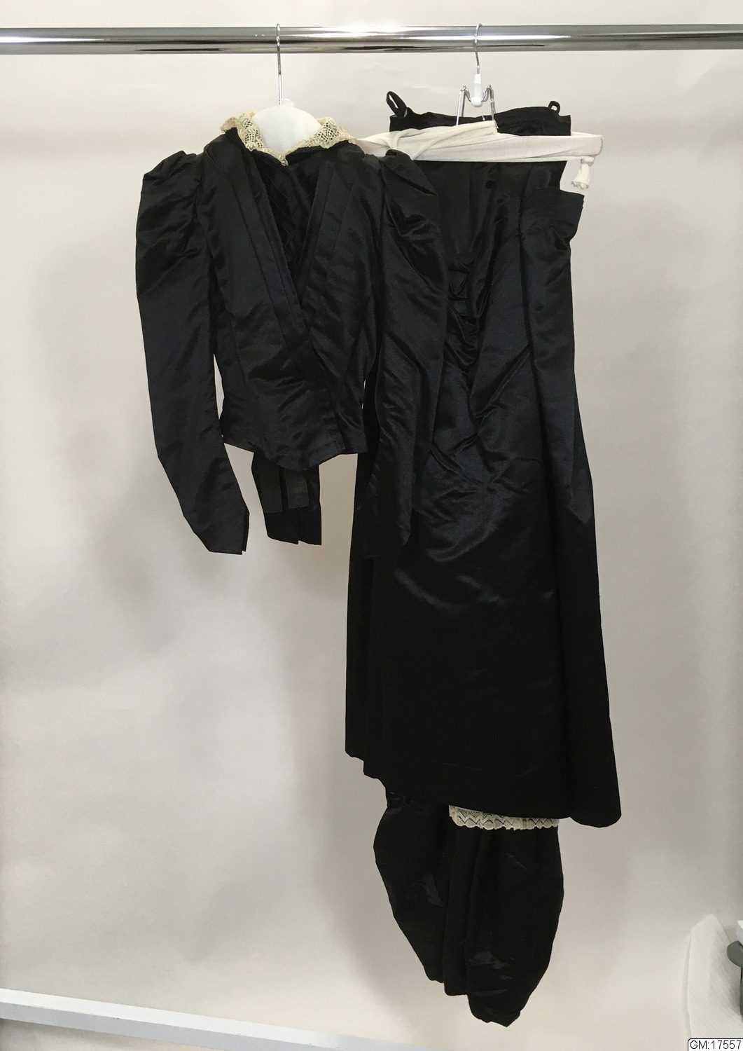 Klädning. Siden, svart atlas. Består av liv och kjol.