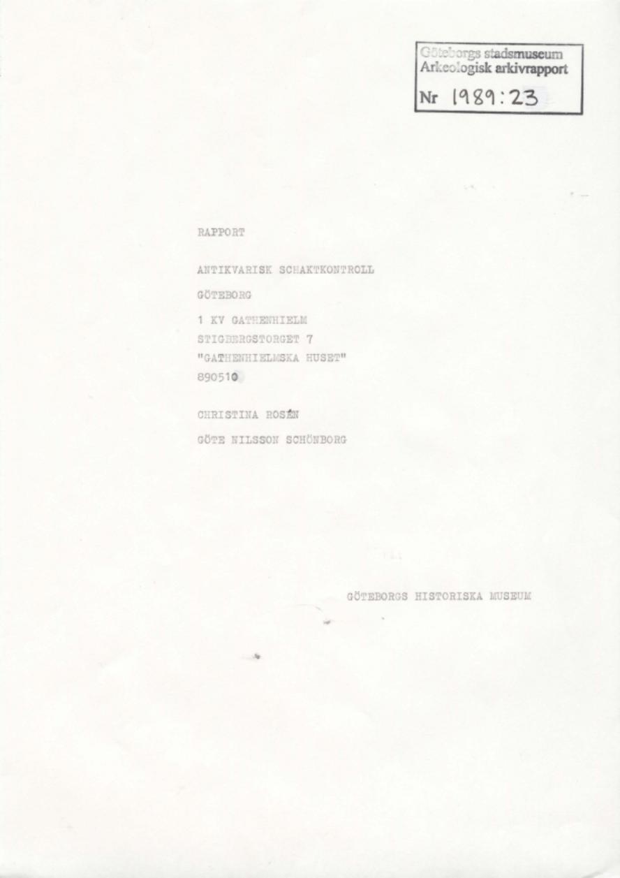 ; Rapport, Antikvarisk schaktkontroll, Göteborg; 1 kv Gathenhielm, Stigbergstorget 7, "Gathenhielmska huset" 890510