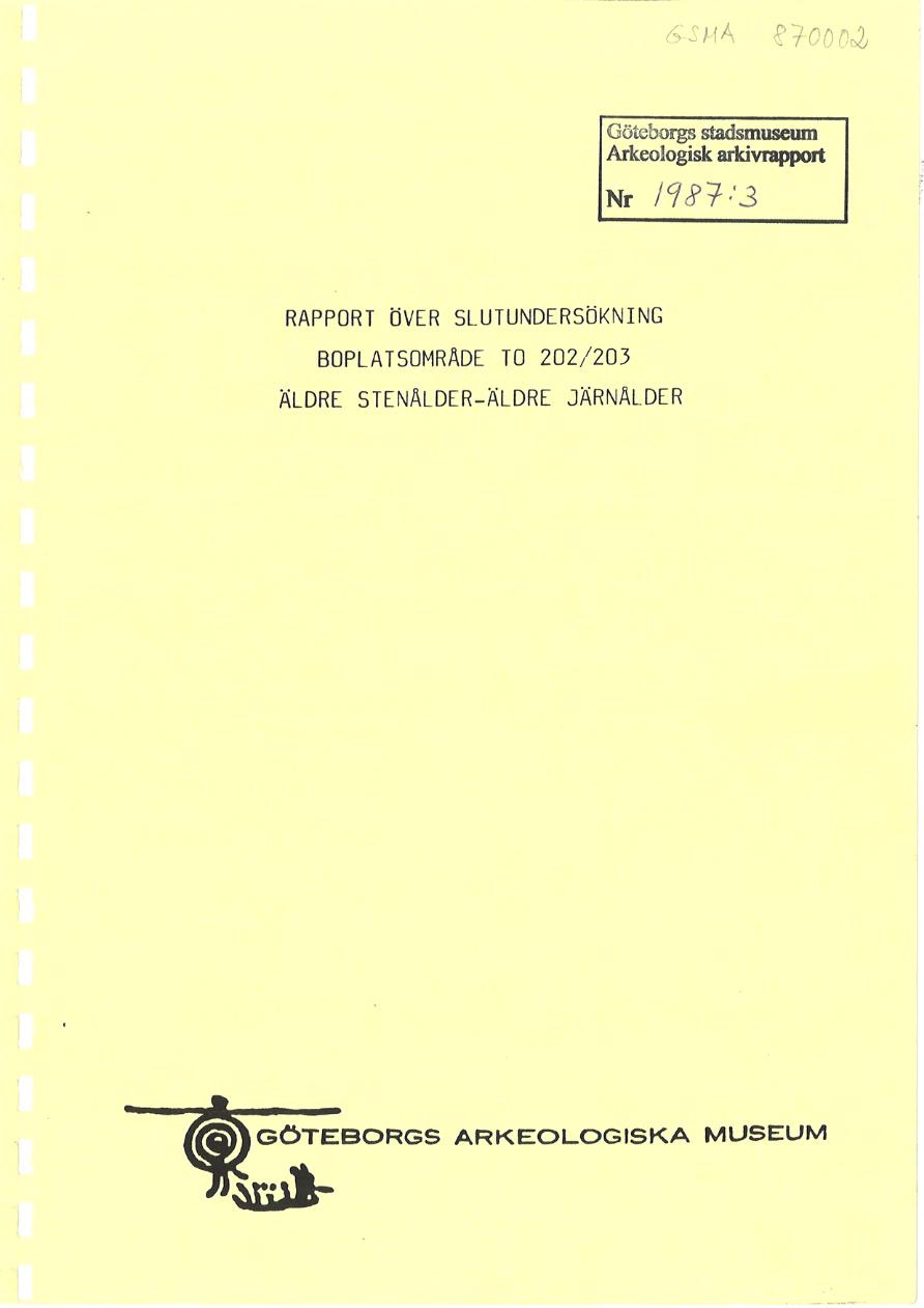 ; Boplatsområde To 202/203; Äldre stenålder-äldre järnålder; Arkeologisk rapport 1987:3