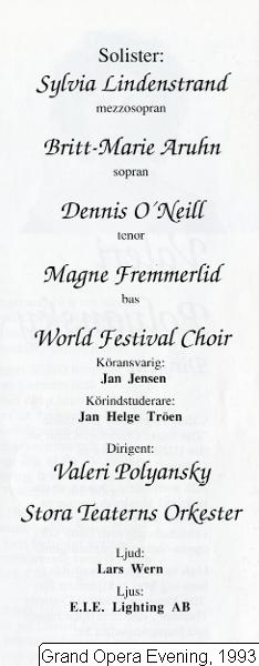 Aruhn, Britt-Marie; Fremmerlid, Magne; Lindenstrand, Sylvia; O´Neill, Dennis; Stora Teaterns orkester; World Festival Choir