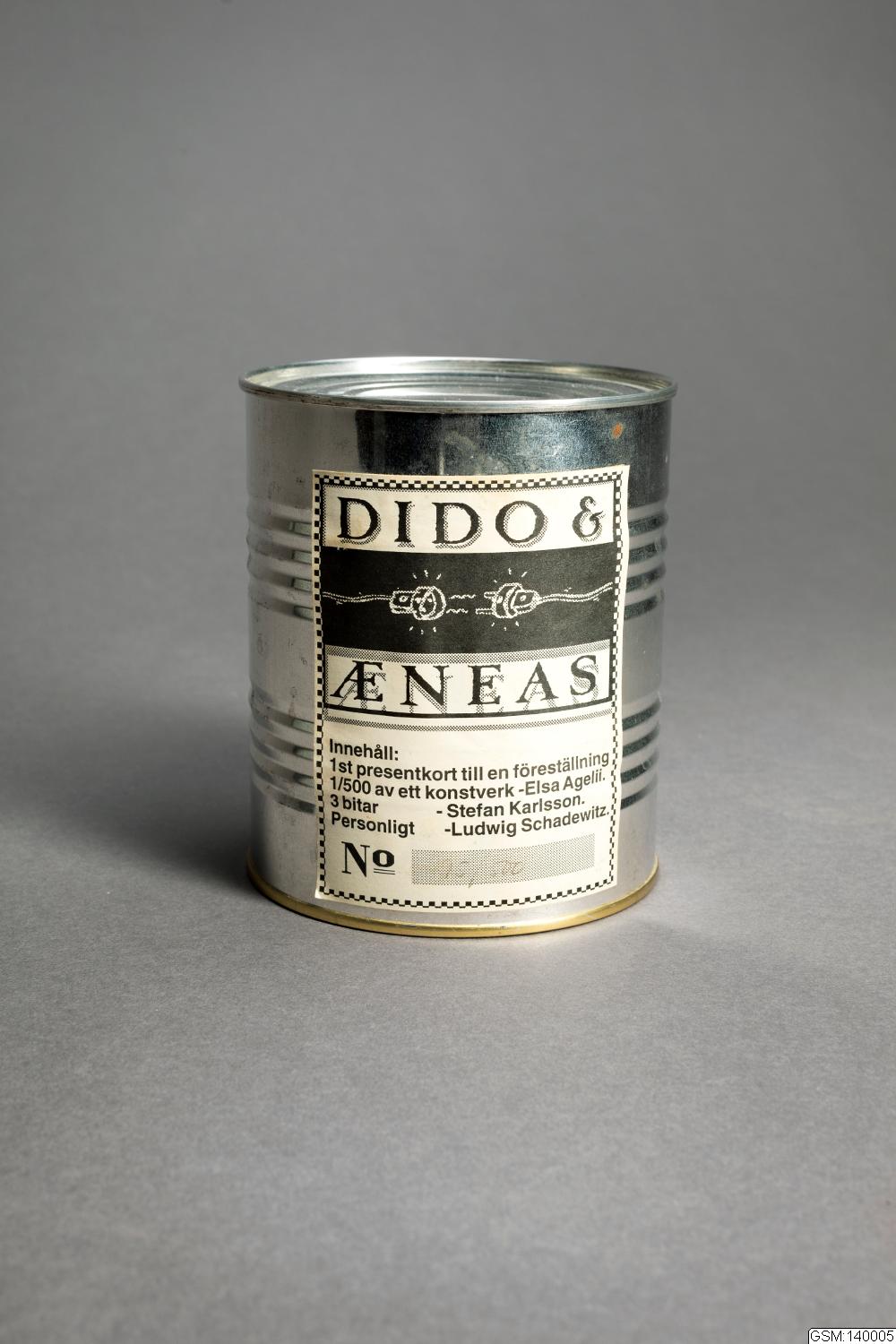 - Konservburk (oöppnad) av metall med 2 klistermärken på sidan. Innehåller presentkort till Utomjordiska BarockBolagets uppsättning av Dido & Æneas 1993-01-15, samt sönderklippta konstverk av Elsa Agelli, Stefan Karlsson och Ludwig Schadewitz.
