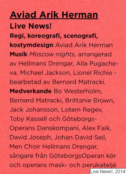 Brown, Brittanie; Falk, Alex; GöteborgsOperans Danskompani; GöteborgsOperans Kör; Hellmans Drenger [Men Choir]; Johansson, Jack; Joseph, David; Kassel, Toby; Matracki, Bernard; Regev, Lotem; Seil, David; Westerholm, Bo, 1951-