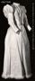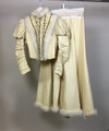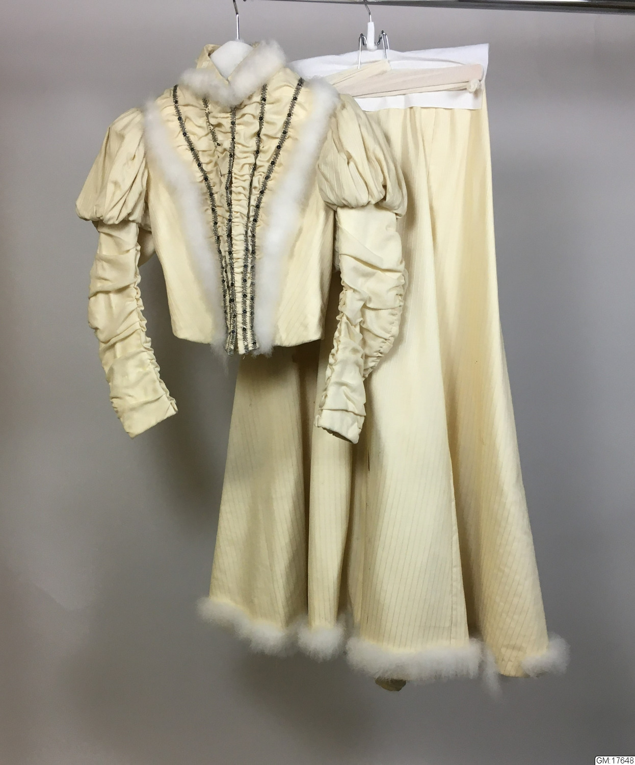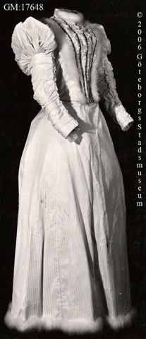 Livet av vitt ylle. De rynkade partierna mitt fram och bak samt den smala delen av ärmarna av slätt vitt ylletyg; livets sidostycken, kragen och ärmarnas puffar vitt ylle med smla silkesändar.