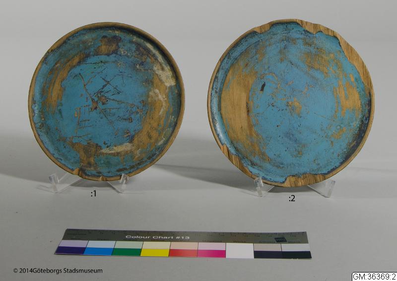 En av nio tallrikar svarvade i trä och blåmålade. Med stor sannolikhet från det lilla museum över tidigare barnhem i Göteborg som fanns på Vidkärrs barnhem