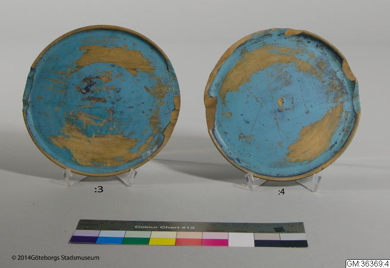 En av nio tallrikar svarvade i trä och blåmålade. Med stor sannolikhet från det lilla museum över tidigare barnhem i Göteborg som fanns på Vidkärrs barnhem