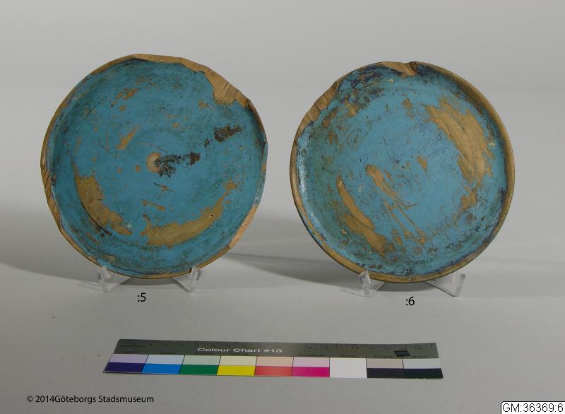 - En av nio tallrikar svarvade i trä och blåmålade. Med stor sannolikhet från det lilla museum över tidigare barnhem i Göteborg som fanns på Vidkärrs barnhem